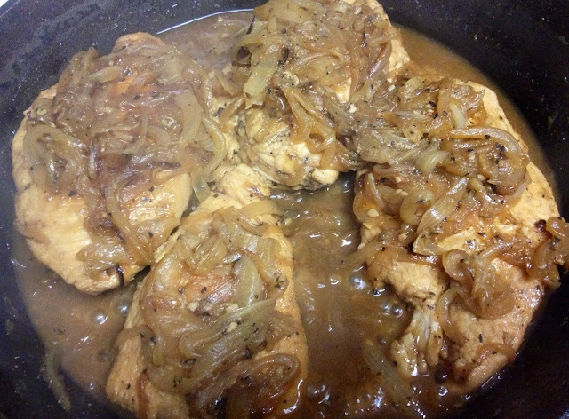 Next I seasoned 4 chicken breasts with some of the cajun seasoning and set them on top of the onions. I scooped the onions over the top and browned the chicken on one side. Then I flipped the chicken breasts over, scooped the onions over the top again, and cooked the other side.