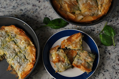 Spanakopita certainly isn't new to the blog. I've shared it twice; once early on, and once when my kitchen was redone. My family's version came from a Greek cookbook purchased at a Greekfest (so, at the Greek Orthodox Church), and has evolved slightly over time. And there are many ways to make spanakopita (though, the mini triangles I grew up with are called spanakopitakia, instead). My family version involved at it's core spinach, feta, cottage cheese, phyllo, and butter. And I should note that I remember a cooking show with a Greek host featuring Greek Yogurt over cottage cheese, and I've seen it with ricotta and cream cheese as well.